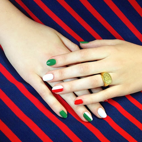 Italy's fashion industry has been walking in the tip of the world, the use of red and green color is the hallmark of the Italian flag. Contrasting colors in the same hands again, this is undoubtedly the most headache problem let manicurist. Madeline Poole recommend, will be two color transition, middle finger separation in white, so as not to create too!